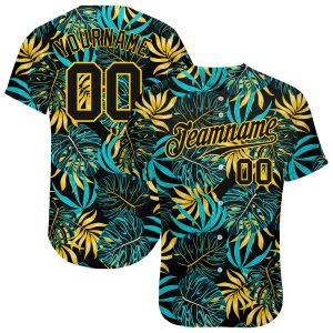 Custom Black Black-Gold 3D Pattern Design Tropical Palm Leaves Authentic Baseball Jersey