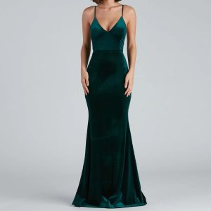 Special Occasion Have a major chic moment in the stylish and stunning Ava velvet formal dress! She features a sleeveless deep V-neckline. spaghetti straps. a high waist seam. ruched detailing. and a floor-length mermaid silhouette with a thigh-high front slit. Complete the look with rhinestone statement earrings and heels. Fit & Features Sleeveless deep V-neckline....