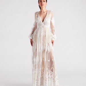 $126.40 – $129.95Special Occasion A floral flocked velvet design brings drama and sophistication to the Evelyn formal dress perfect for leaving an impression at school dances or weddings! She features elegant peasant long sleeves. a plunge V-neckline. empire waistband atop her flowy. A-line silhouette leading to the floor-sweeping hem. The formal dress is composed of sheer tulle...