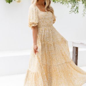$130.89 – $131.92Length from shoulder to hem for size S: 130cm Yellow print maxi dress. Lined. Cold hand wash only. Model is a standard XS and is wearing size XS. True to size. Non-stretchy and lightweight woven satin fabric. Print placement may vary. Rayon. Feel floaty in this gorgeous maxi! Featuring puff sleeved. a shirred bodice and...