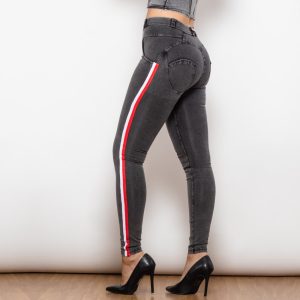 Buttoned Mid Rise Side Striped Skinny Stretch Jeggings – Gray