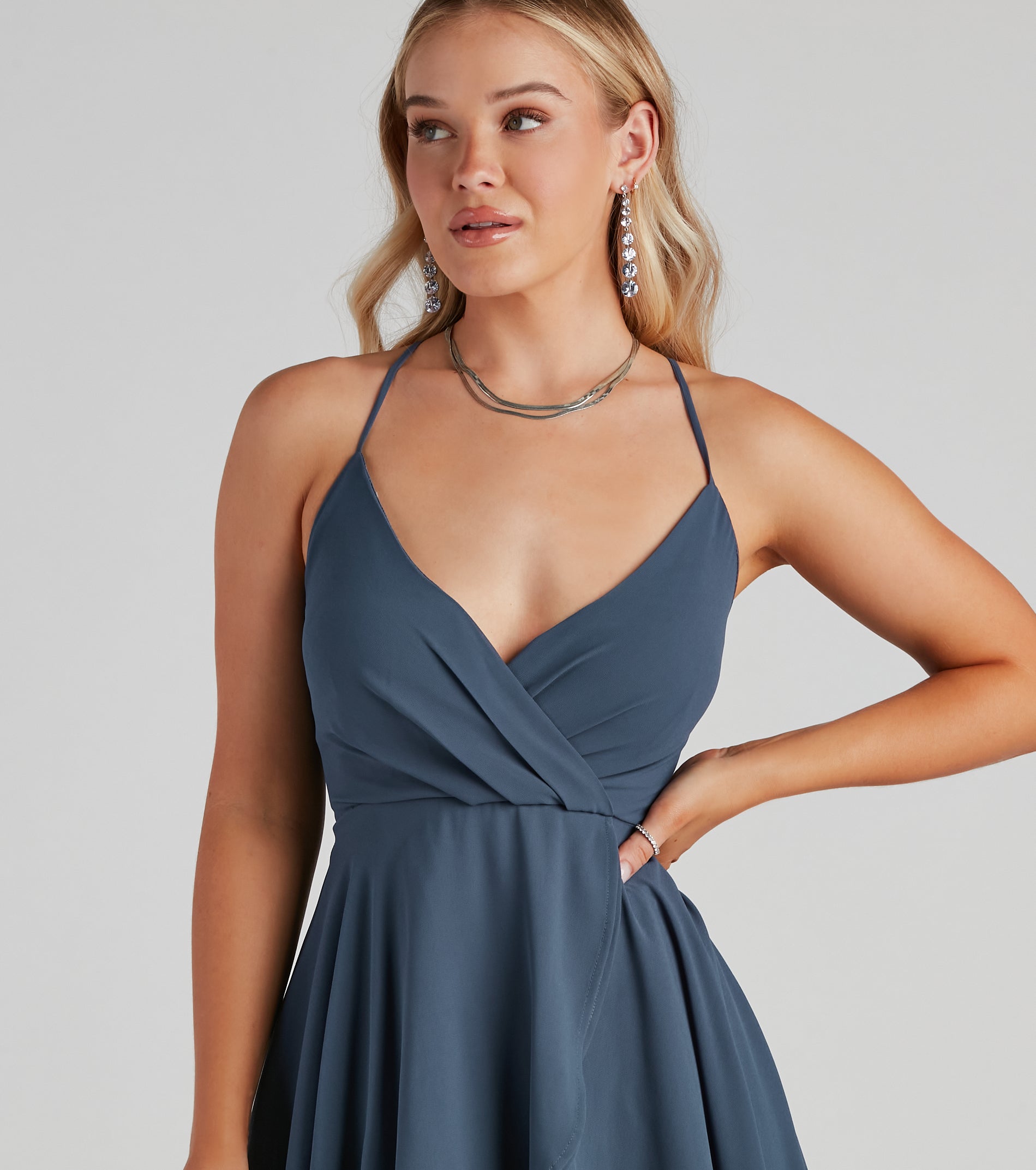 Flutter away in a twirl-worthy skater dress! The dress features a sleeveless wrap V-neckline. adjustable spaghetti straps. and a tiered skater silhouette. The dress is composed of a lined chiffon fabric that offers a relaxed fit with a minimal stretch. Complete look with mules and dainty rings.
