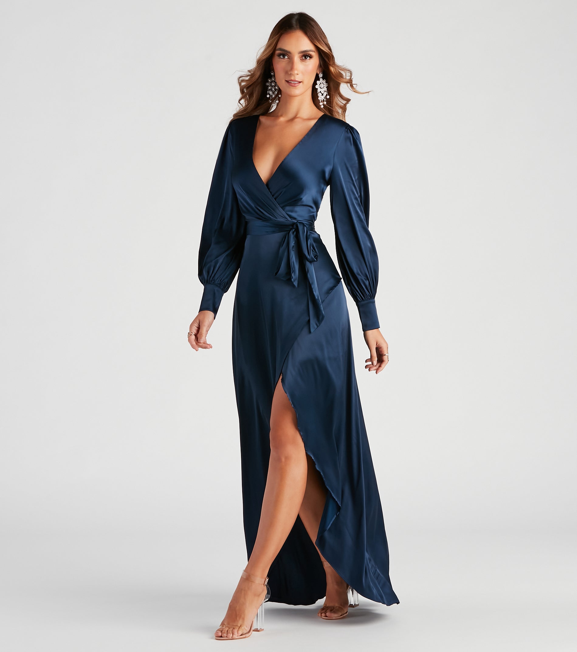 Sleek and stunning. the Kali formal satin wrap dress is the perfect wedding guest dress! She features a sleeveless V-neckline with a wrap-front design. long sleeves with tapered hems. a high waist seam with a tie-back design. a floor-length. wrap-front silhouette with a high front slit to showcase some leg. and a flowy fit. The smooth woven satin fabric includes a short knit lining. Style this dress with rhinestone earrings.